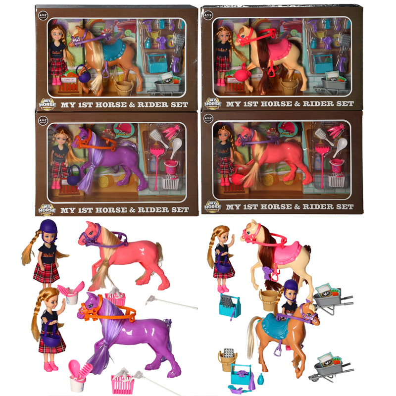 COMPLETE PLAYSET: Includes fashion doll with riding outfit, poseable horse figure with brushable mane and tail, riding helmet, saddle, bridle, grooming accessories, stable bucket, and additional care items for immersive equestrian play