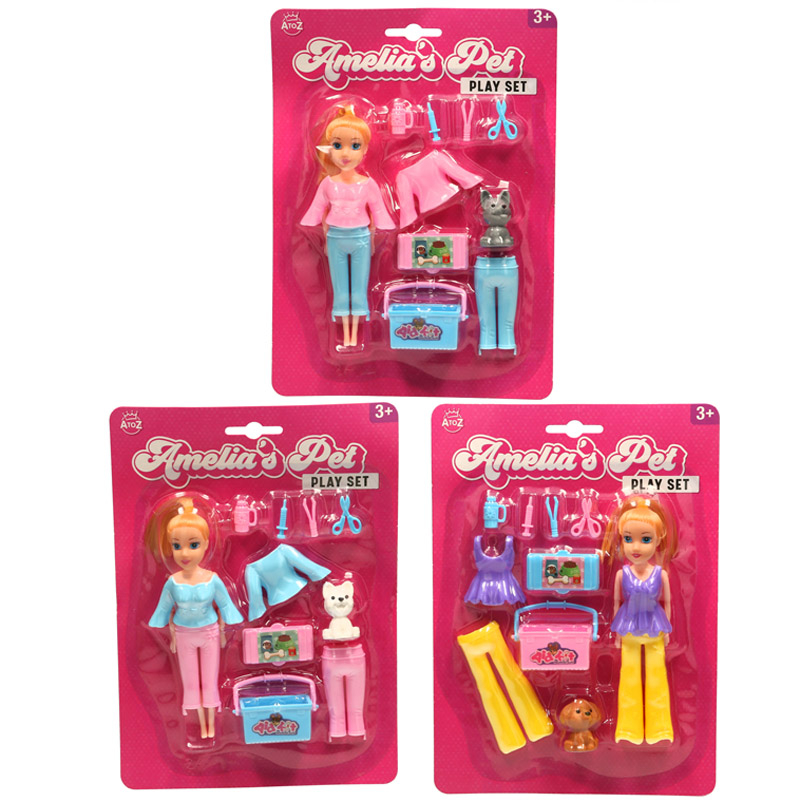 The AtoZ Amelia's Pet Play Set brings imaginative pet care adventures to life for young children. This delightful play set features Amelia, a charming doll with blonde hair and bright blue eyes, ready to look after her adorable pet companion. The set includes everything needed for hours of creative role-play, from grooming accessories like scissors and a comb to essential pet care items such as a water bottle and syringe for pretend veterinary visits. Children will love the included pet carrier for transporting their furry friend, along with an extra outfit so Amelia can change for different occasions. The adorable pet figure�available in various designs including cats and dogs�adds realistic charm to playtime scenarios. Suitable for ages 3 and up, this comprehensive play set encourages nurturing skills, responsibility, and storytelling as children create their own pet care adventures. Each package contains the Amelia doll, one pet figure, clothing accessories, grooming tools, and pet care accessories, all presented in attractive packaging. Perfect for young animal lovers who dream of caring for their own pets!