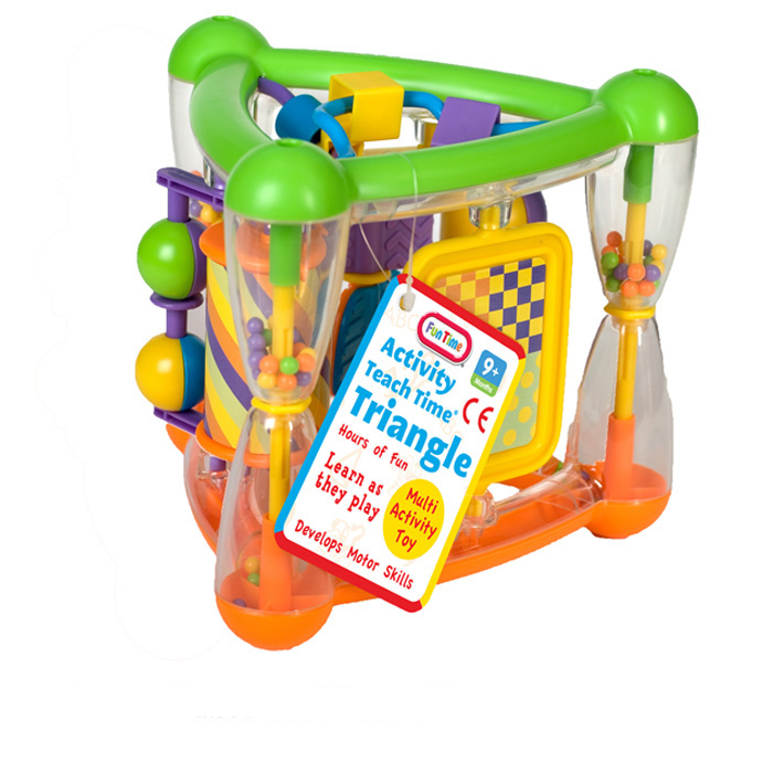 The Fun Time Activity Teach Time Triangle is a vibrant, multi-activity toy designed to captivate and educate young minds. This colourful triangular toy features multiple engaging activities on each side, providing hours of entertainment whilst developing essential motor skills. With its bright green, yellow, orange, and purple components, this interactive toy includes spinning elements, rattling beads, and various textures that encourage exploration and sensory development. Suitable for babies and toddlers aged 9 months and up, this toy is perfectly sized for little hands to grasp, shake, and manipulate. The transparent sides allow children to watch the colourful beads move and create fascinating visual effects, helping to develop hand-eye coordination and cause-and-effect understanding. Measuring 19 x 18 x 20cm, this compact activity centre is ideal for home play or taking along on outings. The Fun Time Activity Teach Time Triangle makes an excellent gift for young children embarking on their developmental journey through play.
